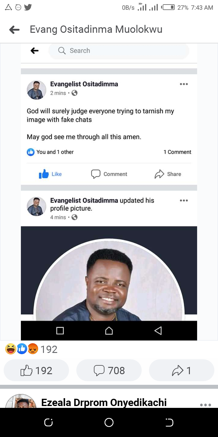 Pastor Osita was revealed yesterday by a Facebook hacker who hacks his Facebook account and reveals most of the chats of the pastor with married women.